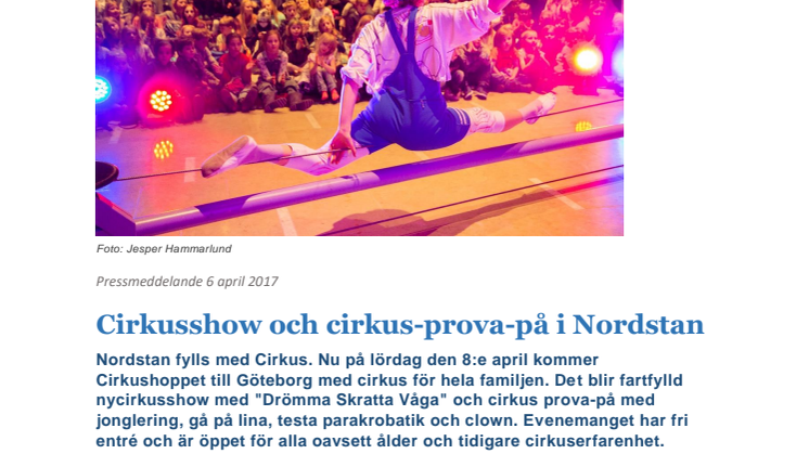 Nordstan fylls med Cirkus. Nu på lördag den 8:e april kommer Cirkushoppet till Göteborg med cirkus för hela familjen. Det blir fartfylld nycirkusshow med "Drömma Skratta Våga" och cirkus prova-på med jonglering, gå på lina, testa parakrobatik och clown. Evenemanget har fri entré och är öppet för alla oavsett ålder och tidigare cirkuserfarenhet.