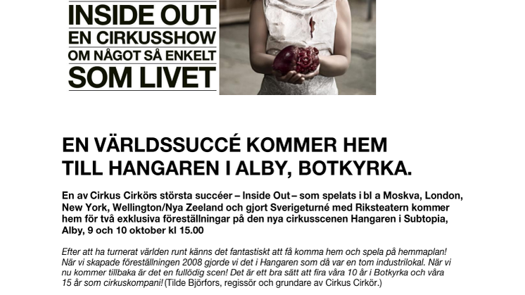 En av Cirkus Cirkörs största succéer – Inside Out – som spelats i bl a Moskva, London, New York, Wellington/Nya Zeeland och gjort Sverigeturné med Riksteatern kommer hem för två exklusiva föreställningar på den nya cirkusscenen Hangaren i Subtopia, Alby, 9 och 10 oktober kl 15.00