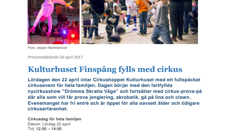 Lördagen den 22 april intar Cirkushoppet Kulturhuset med ett fullspäckat cirkusevent för hela familjen. Dagen börjar med den fartfyllda nycirkusshow Drömma Skratta Våga och fortsätter med cirkus-prova-på där alla som vill får prova jonglering, akrobatik, gå på lina och clown. Evenemanget har fri entré och är öppet för alla oavsett ålder och tidigare cirkuserfarenhet.