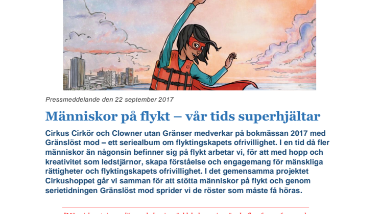 Cirkus Cirkör och Clowner utan Gränser medverkar på bokmässan 2017 med Gränslöst mod – ett seriealbum om flyktingskapets ofrivillighet. I en tid då fler människor än någonsin befinner sig på flykt arbetar vi, för att med hopp och kreativitet som ledstjärnor, skapa förståelse och engagemang för mänskliga rättigheter och flyktingskapets ofrivillighet. I det gemensamma projektet Cirkushoppet går vi samman för att stötta människor på flykt och genom serietidningen Gränslöst mod sprider vi de röster som måste få höras.