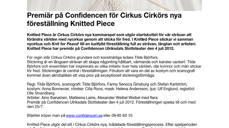 Knitted Piece är Cirkus Cirkörs nya kammarspel som utgör startskottet för vår strävan att förändra världen med nycirkus genom att sticka för fred. I Knitted Piece stickar vi samman nycirkus och Knit for Peace[1] till en lustfylld föreställning full av strävan, längtan och artisteri. Knitted Piece har premiär på Confidencen Ulriksdals Slottsteater den 4 juli 2012.