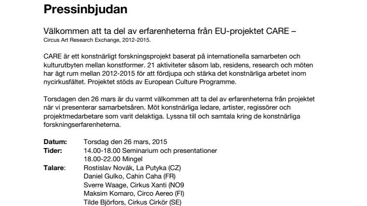 CARE är ett konstnärligt forskningsprojekt baserat på internationella samarbeten och kulturutbyten mellan konstformer. 21 aktiviteter såsom lab, residens, research och möten har ägt rum mellan 2012-2015 för att fördjupa och stärka det konstnärliga arbetet inom nycirkusfältet. Projektet stöds av European Culture Programme.