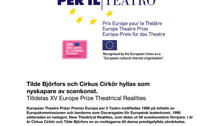 European Theatre Prize/ Premio Europa per il Teatro instiftades 1986 på initiativ av Europakommissionen och benämns som Oscarsgalan för Europeisk teaterkonst. 1990 adderades en kategori, New Theatrical Realities, som delas ut till scenkonstens förnyare. I år är Cirkus Cirkör och Tilde Björfors en av mottagarna till denna prestigefyllda utmärkelse.