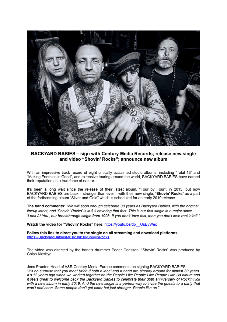 Det har varit en lång väntan sedan Backyard Babies släppte sitt senaste album "Four by Four”, men nu är de tillbaka starkare än någonsin. "Shovin Rocks” är första singeln från kommande albumet ”Sliver & Gold” som förväntas släppas i början av 2019.