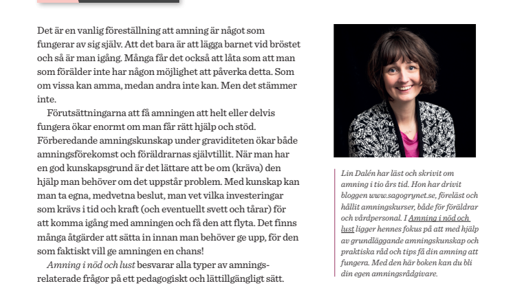 - Jag märkte att det fanns ett stort behov av uppdaterad och lättillgänglig amningshjälp när jag själv fick mitt första barn för tolv år sedan. Jag ville amma men fick inte hjälp. Jag bestämde mig då för att skapa en förändring och började bland annat att blogga och föreläsa om amning. Jag ville göra mitt bästa för att så få som möjligt hädanefter ska hamna i min situation. Nu tar jag nästa steg med den här boken, säger Lin Dalén.