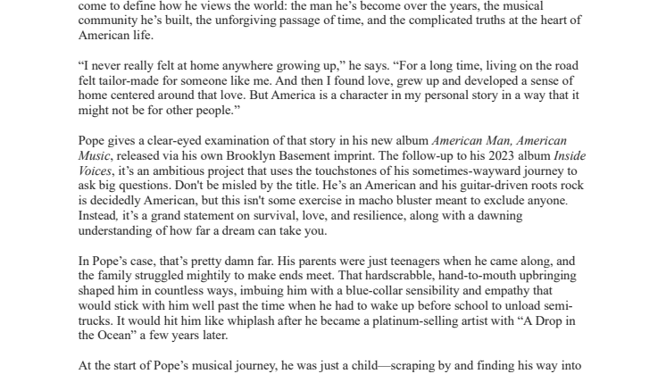”The title of the album is a nod to Ron's hardscrabble upbringing,” skriver Holler om det kommande albumet och låtpremiären. “Born to struggling teenage parents, Ron was often left in the care of relatives and regularly dealt with food insecurity. He never felt at home anywhere - until he discovered the road and the concept of ‘America’ became a frequent character in his personal story, as he formed the idea of what ‘home’ is…Pope gives a clear-eyed examination of that story in his new album “American Man, American Music”.”