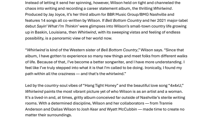 Lainey Wilson vann i år en Grammy i kategorin Best Country Album för albumet "Bell Bottom Country" från 2022, och tiden efter dess release har varit som en virvelvind. Hon har genomfört otaliga turnéer, mottagit utmärkelser som Entertainer of The Year på både CMA och ACM Awards, blivit introducerad till The Grand Ole Opry och mött de höga förväntningar som ställts på countrymusikens obestridliga nya superstjärna. Istället för att tappa greppet kanaliserade Lainey Wilson turbulensen till att skriva och spela in sitt tredje och karriärdefinierande album, ”Whirlwind,” producerat av Jay Joyce. Om ”Bell Bottom Country” och 2021 års ”Sayin' What I'm Thinkin’” gav oss en glimt av Lainey Wilsons uppväxt i småstaden Baskin, Louisiana, så är "Whirlwind", med sina svepande vyer och känsla av oändliga möjligheter, en panoramautsikt över hennes värld idag.
