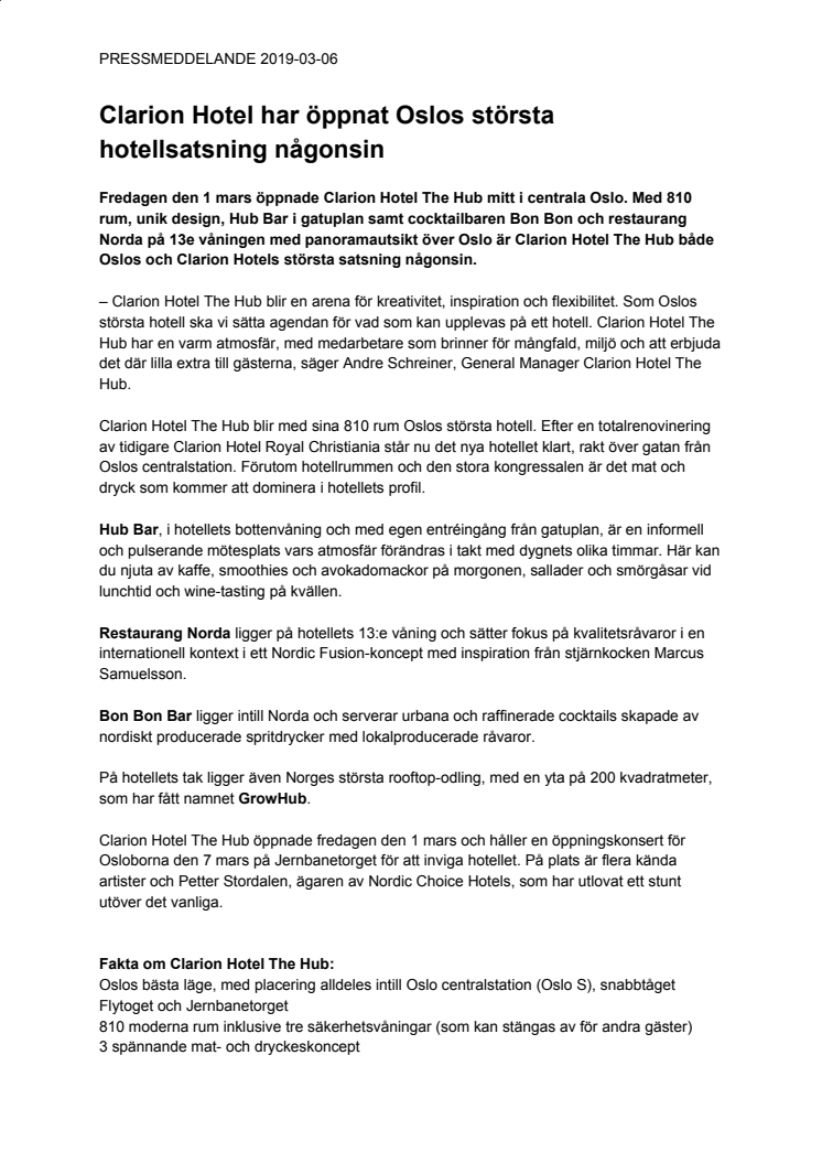 Fredagen den 1 mars öppnade Clarion Hotel The Hub mitt i centrala Oslo. Med 810 rum, unik design, Hub Bar i gatuplan samt cocktailbaren Bon Bon och restaurang Norda på 13e våningen med panoramautsikt över Oslo är Clarion Hotel The Hub både Oslos och Clarion Hotels största satsning någonsin.
