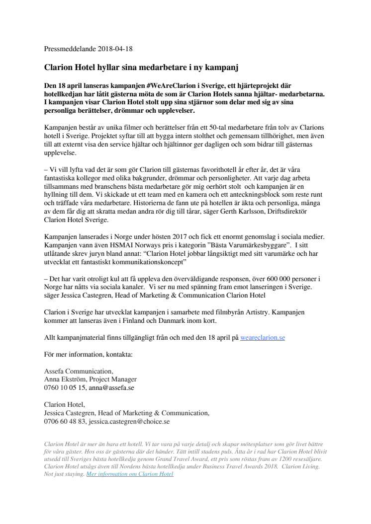 Den 18 april lanseras kampanjen #WeAreClarion i Sverige, ett hjärteprojekt där hotellkedjan har låtit gästerna möta de som är Clarion Hotels sanna hjältar- medarbetarna. I kampanjen visar Clarion Hotel stolt upp sina stjärnor som delar med sig av sina personliga berättelser, drömmar och upplevelser.