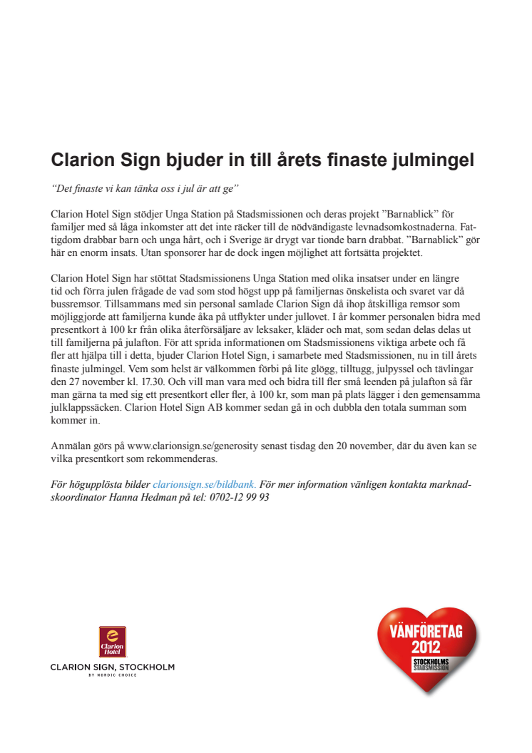 Clarion Hotel Sign stödjer Unga Station på Stadsmissionen och deras projekt "Barnablick" för familjer med så låga inkomster att det inte räcker till de nödvändigaste levnadsomkostnaderna. Fattigdom drabbar barn och unga hårt, och i Sverige är drygt var tionde barn drabbat. "Barnablick" gör här en enorm insats. Utan sponsorer har de dock ingen möjlighet att fortsätta projektet.