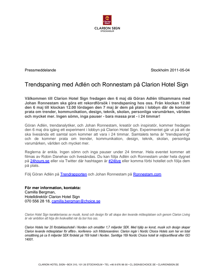 Välkommen till Clarion Hotel Sign fredagen den 6 maj då Göran Adlén tillsammans med Johan Ronnestam ska göra ett rekordförsök i trendspaning hos oss. Från klockan 12.00 den 6 maj till klockan 12.00 lördagen den 7 maj kommer de prata om trender, kommunikation, design, teknik, skolan, personliga varumärken, världen och mycket mer. Ingen sömn, inga pauser - bara massa prat - i 24 timmar!
