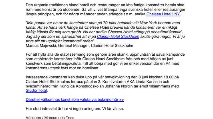 Därefter välkomnas konst som valuta via bokning här: http://www.clarionstockholm.com/rum-for-konst