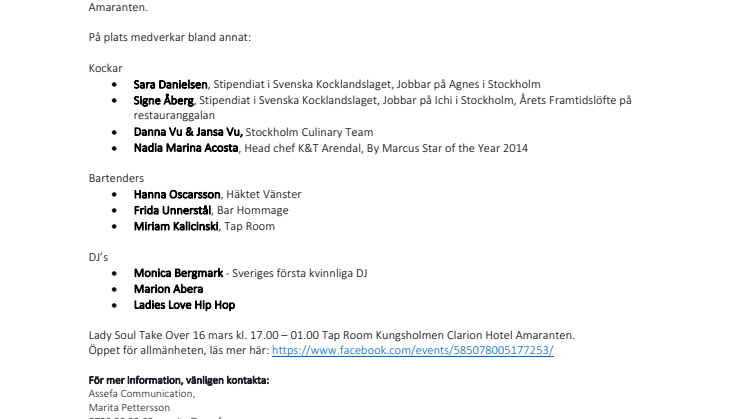 I samband med Women´s History Month möts några av Stockholms mest passionerade och talangfulla kvinnliga profiler inom restaurang-, musik- och barvärlden i en Lady Soul Take Over på Tap Room, Clarion Hotel Amaranten.