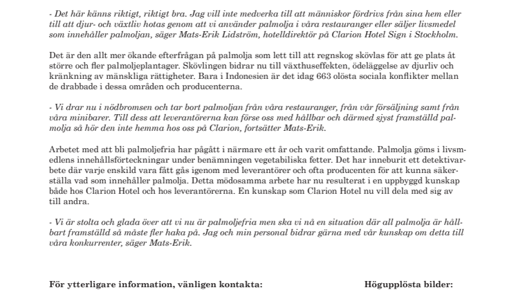 - Det här känns riktigt, riktigt bra. Jag vill inte medverka till att människor fördrivs från sina hem eller till att djur- och växtliv hotas genom att vi använder palmolja i våra restauranger eller säljer livsmedel som innehåller palmoljan, säger Mats-Erik Lidström, hotelldirektör på Clarion Hotel Sign i Stockholm.