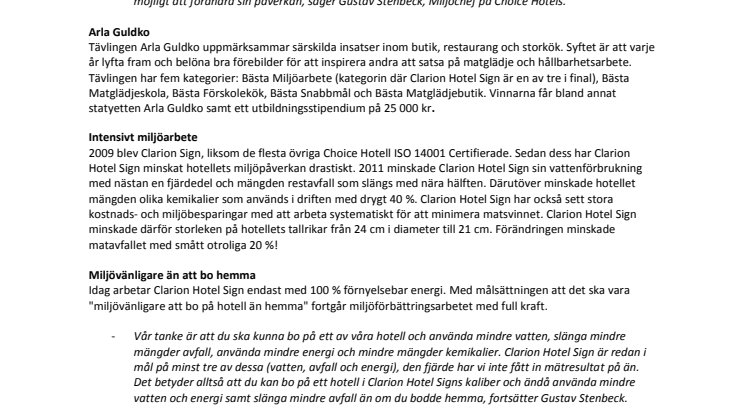 Clarion Hotel Sign har ända sedan öppnandet på Norra Bantorget arbetat enträget med att försöka minimera miljöpåverkan i sin verksamhet. Det är idag mer miljövänligt att bo på Clarion Hotel Sign än att bo hemma. Finalplatsen i Arla Guldko kommer som ett bevis på att Clarion Hotel Sign är på rätt väg.