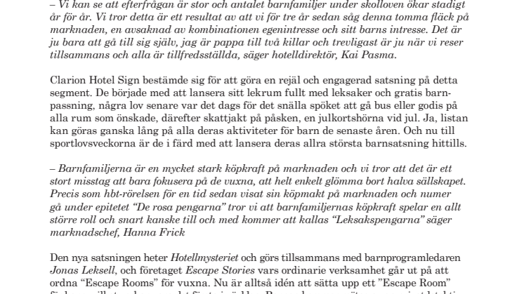 Den nya satsningen heter Hotellmysteriet och görs tillsammans med barnprogramledaren Jonas Leksell, och företaget Escape Stories vars ordinarie verksamhet går ut på att ordna “Escape Rooms” för vuxna. Nu är alltså idén att sätta upp ett ”Escape Room” för barn, vilket verkar vara det första i världen. Barnen kommer mötas av en privatdetektiv i lobbyn som berättar om ett brott som begåtts. Därefter kommer barnen med hjälp av ledtrådar få försöka lösa mysteriet som börjar med att hitta rummet där mysteriet utspelar sig. Det kommer att vara som att kliva rakt in i en spännande pusseldeckare, och dessutom få spela huvudrollen.