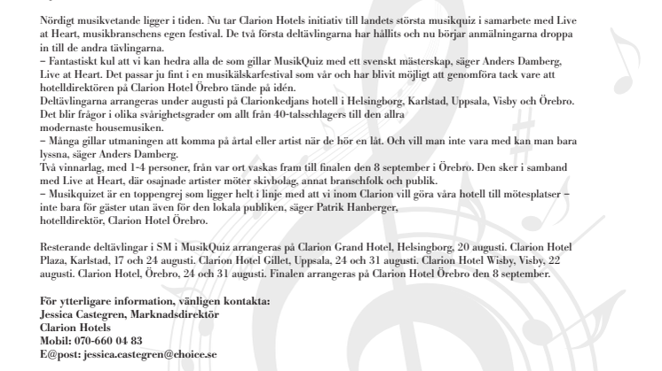 I dagarna startar Clarion Hotels de första svenska mästerskapen i MusikQuiz. Fram till sista augusti pågår deltävlingarna på Clarionkedjans hotell i Helsingborg, Karlstad, Uppsala, Visby samt Örebro där det också blir final den 8 september.