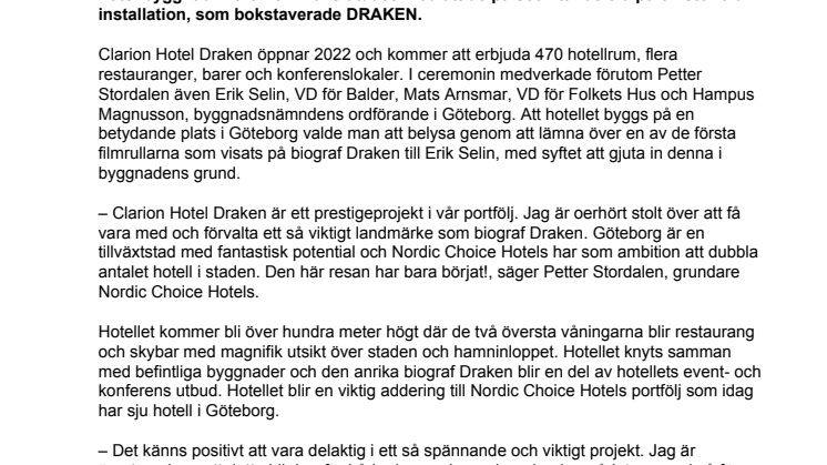 Clarion Hotel Draken öppnar 2022 och kommer att erbjuda 470 hotellrum, flera restauranger, barer och konferenslokaler. I ceremonin medverkade förutom Petter Stordalen även Erik Selin, VD för Balder, Mats Arnsmar, VD för Folkets Hus och Hampus Magnusson, byggnadsnämndens ordförande i Göteborg. Att hotellet byggs på en betydande plats i Göteborg valde man att belysa genom att lämna över en av de första filmrullarna som visats på biograf Draken till Erik Selin, med syftet att gjuta in denna i byggnadens grund.