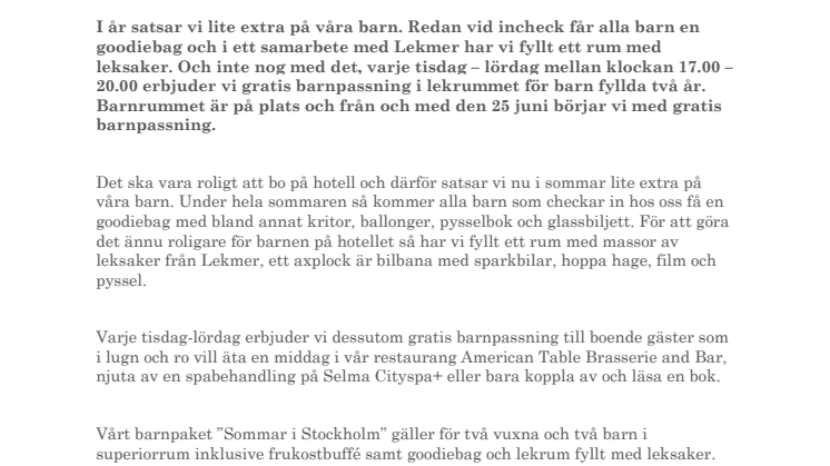 Vårt barnpaket ”Sommar i Stockholm” gäller för två vuxna och två barn i superiorrum inklusive frukostbuffé samt goodiebag och lekrum fyllt med leksaker. Priset för hela familjen är 1495 SEK per natt med bokning i två nätter. Paketet ”Sommar i Stockholm” bokas via telefon 08-676 98 00 och gäller under perioden 19/6-19/8 2013. Läs mer om våra paket på www.clarionsign.se.