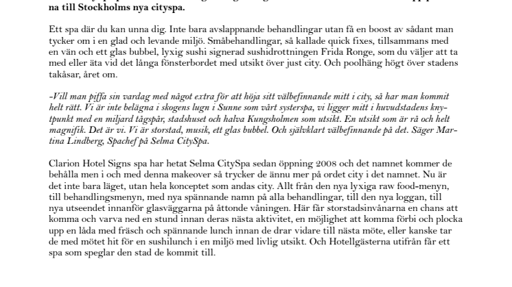 Clarion Hotel Signs spa har hetat Selma CitySpa sedan öppning 2008 och det namnet kommer de behålla men i och med denna makeover så trycker de ännu mer på ordet city i det namnet. Nu är det inte bara läget, utan hela konceptet som andas city. Allt från den nya lyxiga raw food-menyn, till behandlingsmenyn, med nya spännande namn på alla behandlingar, till den nya loggan, till nya utseendet innanför glasväggarna på åttonde våningen. Här får storstadsinvånarna en chans att komma och varva ned en stund innan deras nästa aktivitet, en möjlighet att komma förbi och plocka upp en låda med fräsch och spännande lunch innan de drar vidare till nästa möte, eller kanske tar de med mötet hit för en sushilunch i en miljö med livlig utsikt. Och Hotellgästerna utifrån får ett spa som speglar den stad de kommit till.