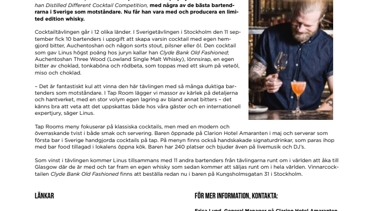 Linus Morgan, barchef på nyöppnade Kungsholmsbaren Tap Room på Clarion Amaranten, var den som imponerade mest på juryn i The Auchentoshan Distilled Different Cocktail Competition, med några av de bästa bartendrarna i Sverige som motståndare. Nu får han vara med och producera en limited edition whisky.