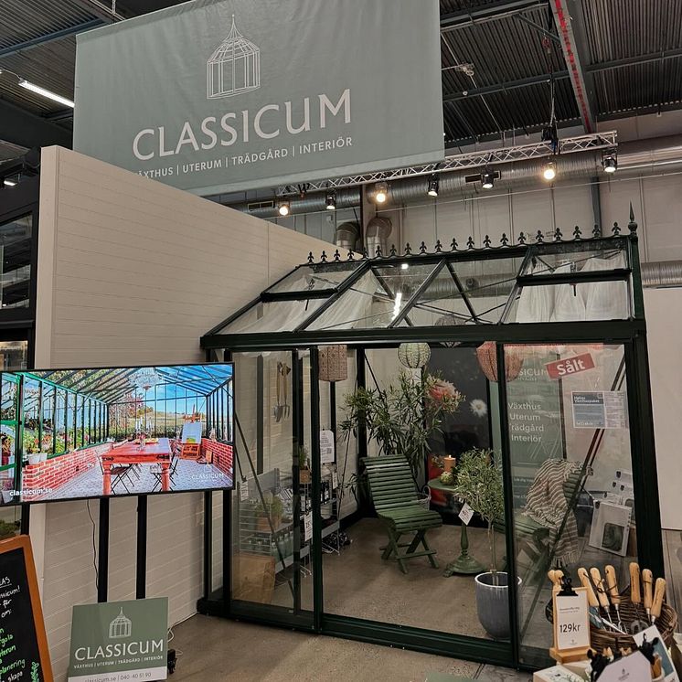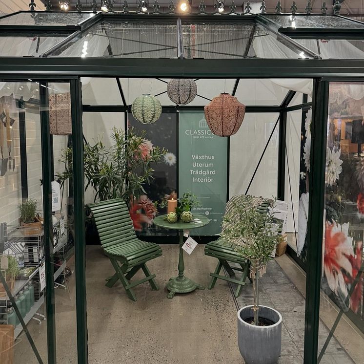 - I Stockholm kan besökarna se det eleganta växthusmodellen Antique samt ett uterum från vår nylanserade svensktillverkade uterumsserie CL Alu.