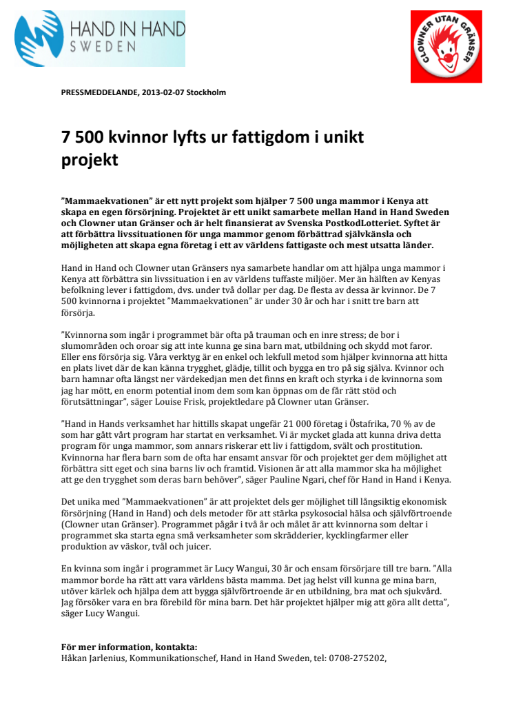 ”Mammaekvationen” är ett nytt projekt som hjälper 7 500 unga mammor i Kenya att skapa en egen försörjning. Projektet är ett unikt samarbete mellan Hand in Hand Sweden och Clowner utan Gränser. Syftet är att förbättra livssituationen för unga mammor genom förbättrad självkänsla och möjligheten att skapa egna företag i ett av världens fattigaste och mest utsatta länder.