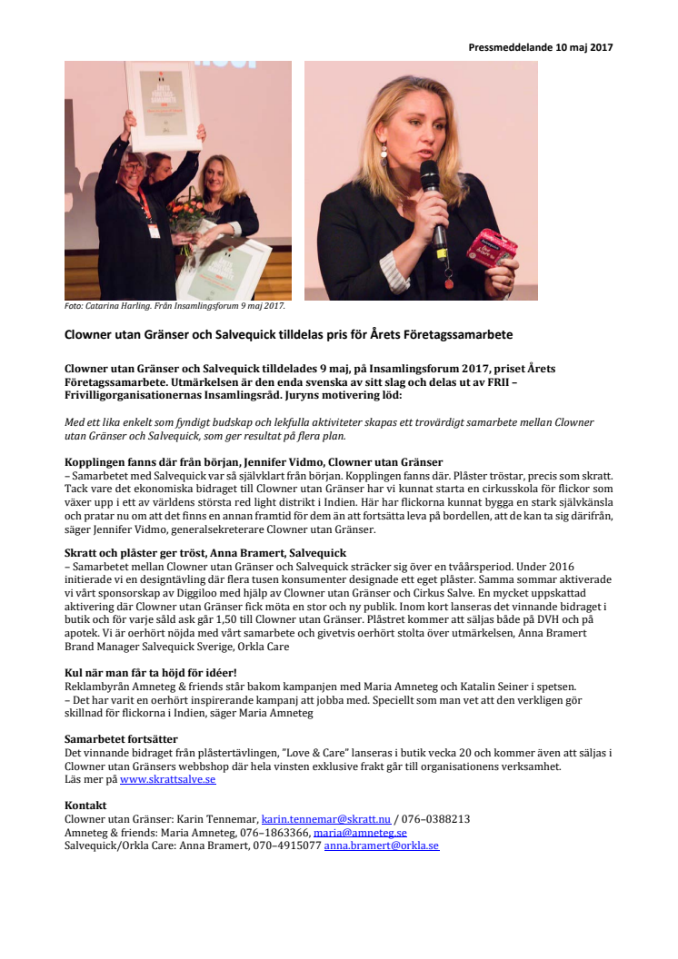 Clowner utan Gränser och Salvequick tilldelas pris för Årets Företagssamarbete