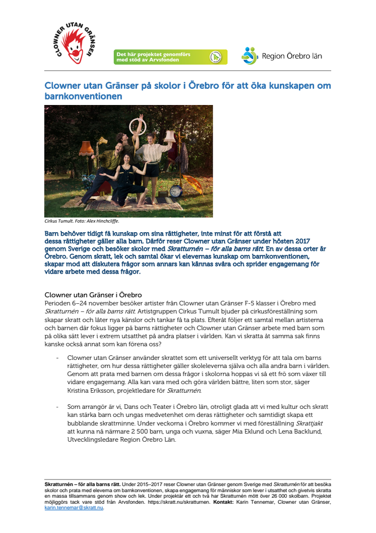 Barn behöver tidigt få kunskap om sina rättigheter, inte minst för att förstå att dessa rättigheter gäller alla barn. Därför reser Clowner utan Gränser under hösten 2017 genom Sverige och besöker skolor med Skratturnén. En av dessa orter är Örebro. Genom skratt och samtal ökar vi elevernas kunskap om barnkonventionen, skapar mod att diskutera frågor som kan kännas svåra och sprider engagemang.