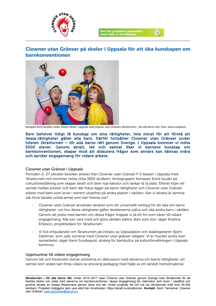 2–27 oktober besöker artister från Clowner utan Gränser F-5 klasser i Uppsala med Skratturnén och kommer möta cirka 3000 skolbarn. Artistgruppen bjuder på cirkusföreställning som skapar skratt och låter nya känslor och tankar få ta plats. Efteråt följer ett samtal mellan artister och barn där fokus ligger på barns rättigheter och Clowner utan Gränser arbete med barn på andra platser i världen.