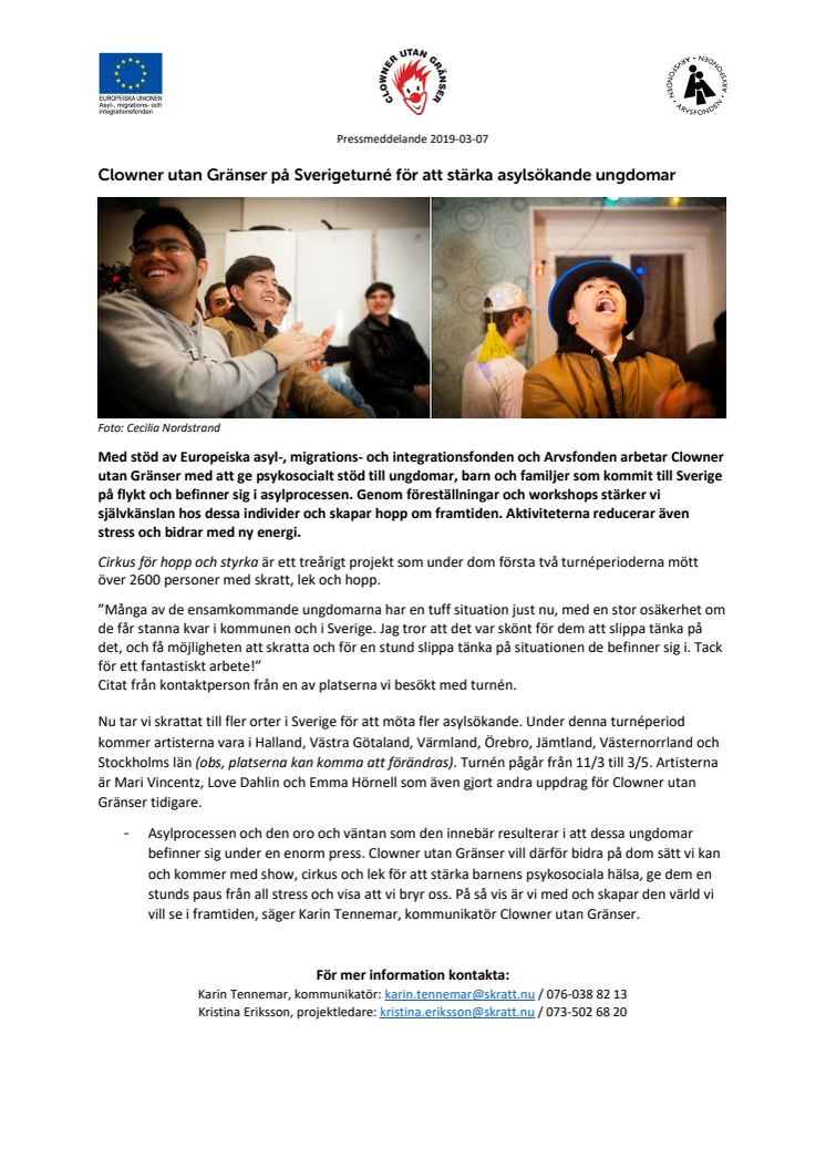 Clowner utan Gränser arbetar med att ge psykosocialt stöd till ungdomar, barn och familjer som kommit till Sverige på flykt och befinner sig i asylprocessen. Genom föreställningar och workshops stärker vi självkänslan hos dessa individer och skapar hopp om framtiden. Aktiviteterna reducerar även stress och bidrar med ny energi. Nu är det dags för en ny turné genom Sverige!