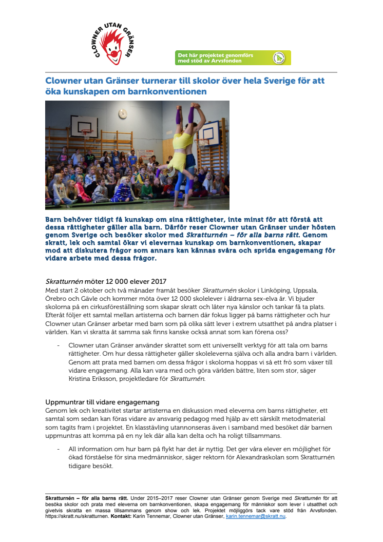 Clowner utan Gränsers Skratturné besöker under hösten skolor i Linköping, Uppsala, Örebro och Gävle och kommer möta över 12 000 skolelever i åldrarna sex-elva år. Vi bjuder skolorna på en cirkusföreställning som skapar skratt och låter nya känslor och tankar få ta plats. Efteråt följer samtal mellan artisterna och barnen där fokus ligger på barns rättigheter och hur Clowner utan Gränser arbete.