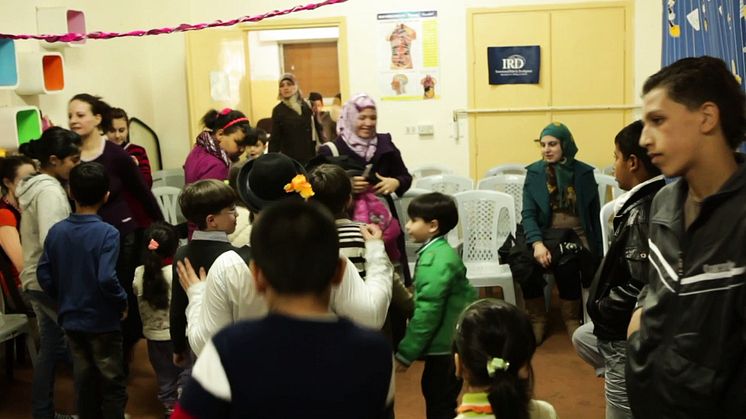 artister från Clowner utan Gränser besöker flyktingboenden, skolor och andra