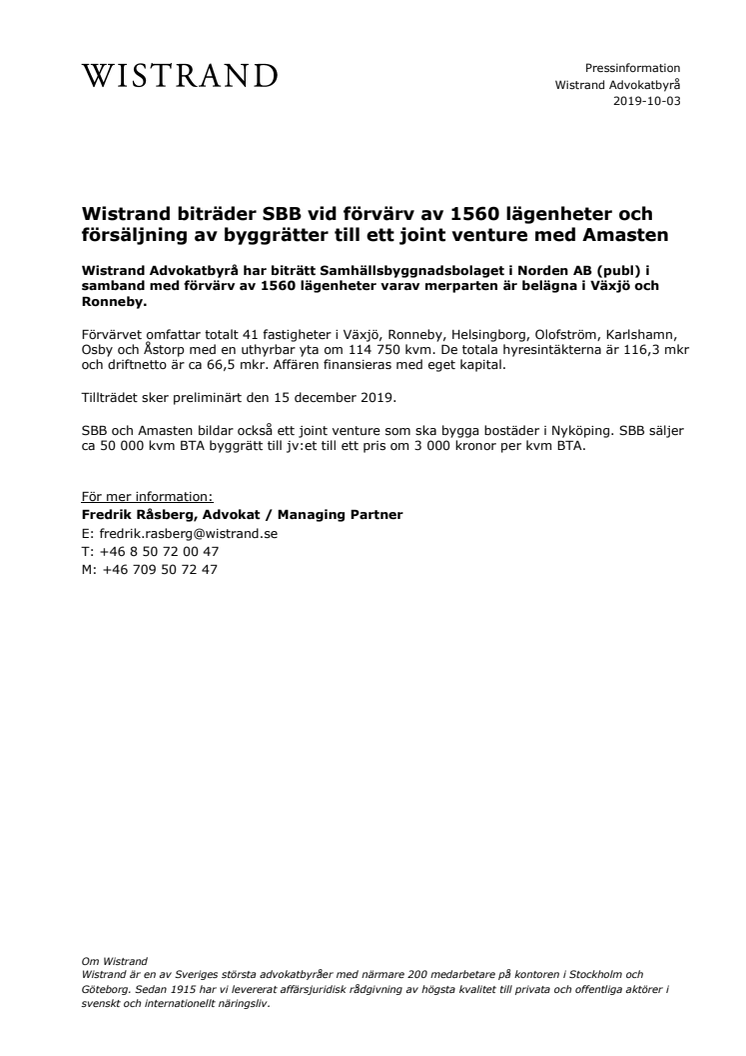 Wistrand biträder SBB vid förvärv av 1560 lägenheter och försäljning av byggrätter till ett joint venture med Amasten