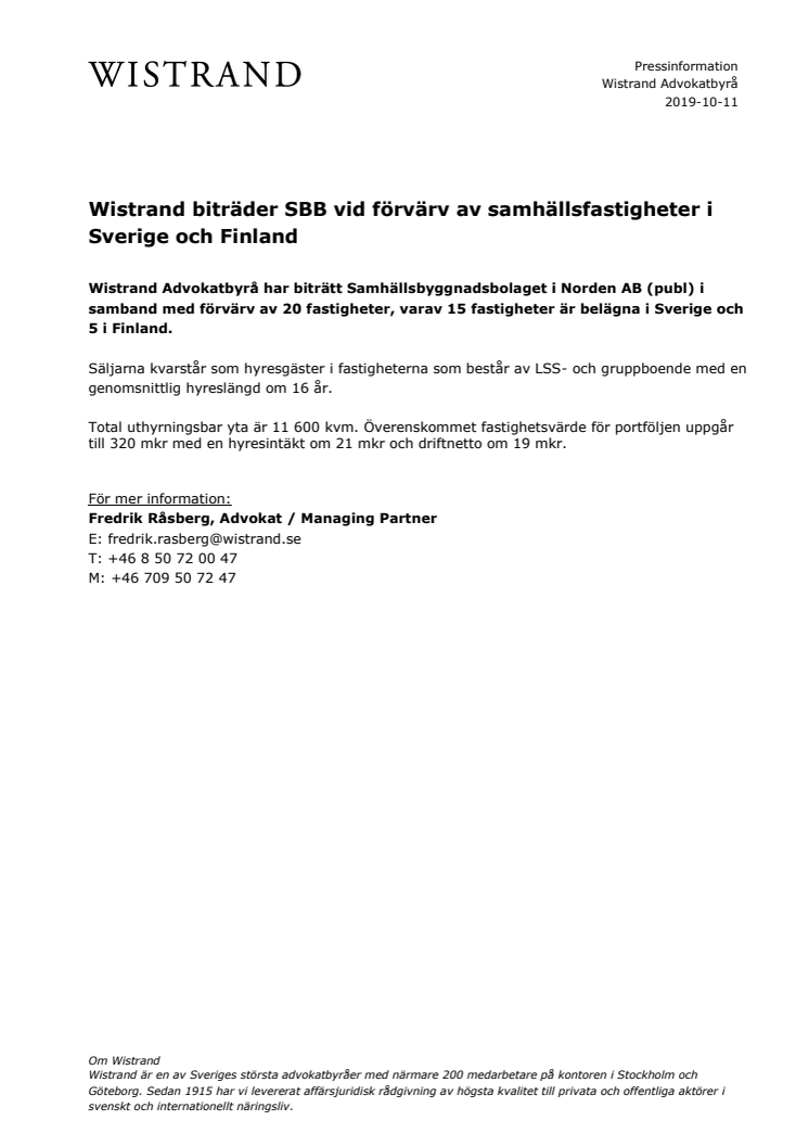 Wistrand biträder SBB vid förvärv av samhällsfastigheter i Sverige och Finland