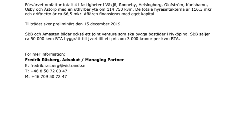 SBB och Amasten bildar också ett joint venture som ska bygga bostäder i Nyköping. SBB säljer ca 50 000 kvm BTA byggrätt till jv:et till ett pris om 3 000 kronor per kvm BTA.