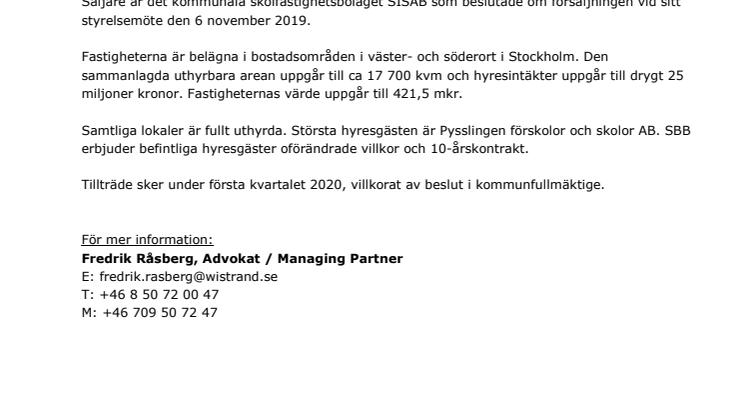 Wistrand biträder SBB vid förvärv av skolfastigheter av SISAB