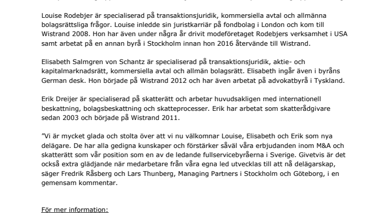 ”Vi är mycket glada och stolta över att vi nu välkomnar Louise, Elisabeth och Erik som nya delägare. De har alla gedigna kunskaper och förstärker såväl våra erbjudanden inom M&A och skatterätt som vår position som en av de ledande fullservicebyråerna i Sverige. Givetvis är det också extra glädjande när medarbetare från våra egna led utvecklas till att nå delägarskap, säger Fredrik Råsberg och Lars Thunberg, Managing Partners i Stockholm och Göteborg, i en gemensam kommentar.