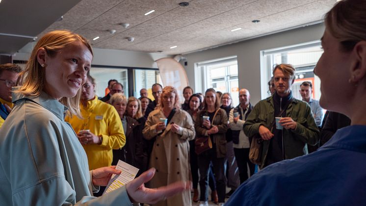 På Bilden; Malin Gucko (Projektutvecklingschef, COLIVE) och Emma Landgren (Community Relations Manager, COLIVE) talar till alla besökare på invigningen i byggnadens Hangout.