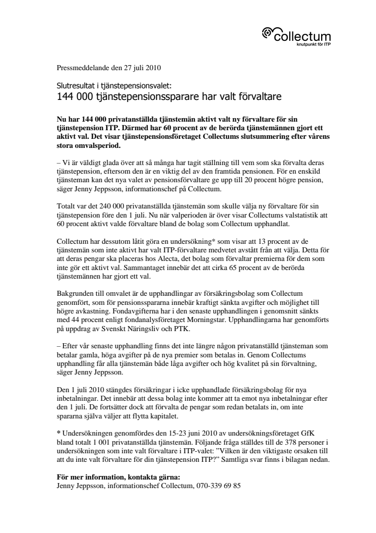 Nu har 144 000 privatanställda tjänstemän aktivt valt ny förvaltare för sin tjänstepension ITP. Därmed har 60 procent av de berörda tjänstemännen gjort ett aktivt val. Det visar tjänstepensionsföretaget Collectums slutsummering efter vårens stora omvalsperiod.