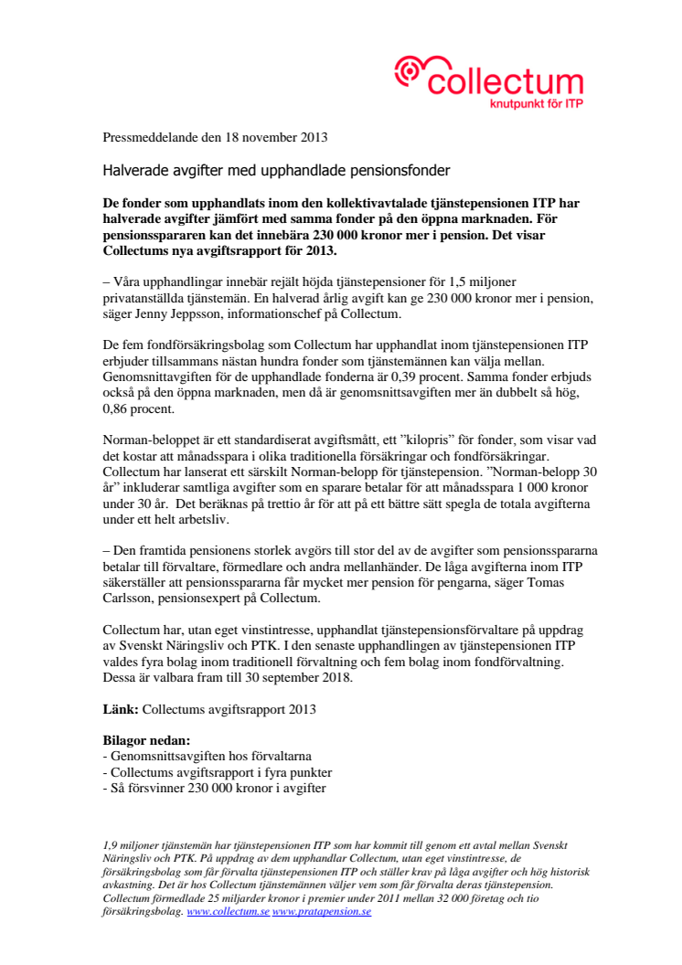 De fonder som upphandlats inom den kollektivavtalade tjänstepensionen ITP har halverade avgifter jämfört med samma fonder på den öppna marknaden. För pensionsspararen kan det innebära 230 000 kronor mer i pension. Det visar Collectums nya avgiftsrapport för 2013.