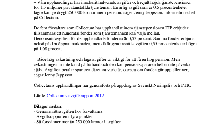 – Våra upphandlingar har inneburit halverade avgifter och rejält höjda tjänstepensioner för 1,5 miljoner privatanställda tjänstemän. En årlig avgift som är 0,5 procentenheter lägre kan ge drygt 250 000 kronor mer i pension, säger Jenny Jeppsson, informationschef på Collectum.