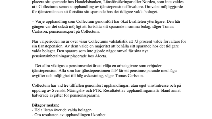 När valperioden nu är över visar Collectums valstatistik att 73 procent valde förvaltare för sin tjänstepension. Av dem valde en majoritet att behålla sitt sparande hos det tidigare valda bolaget. Den sparare som inte gjorde något omval får sina nya pensionsinbetalningar placerade hos Alecta.