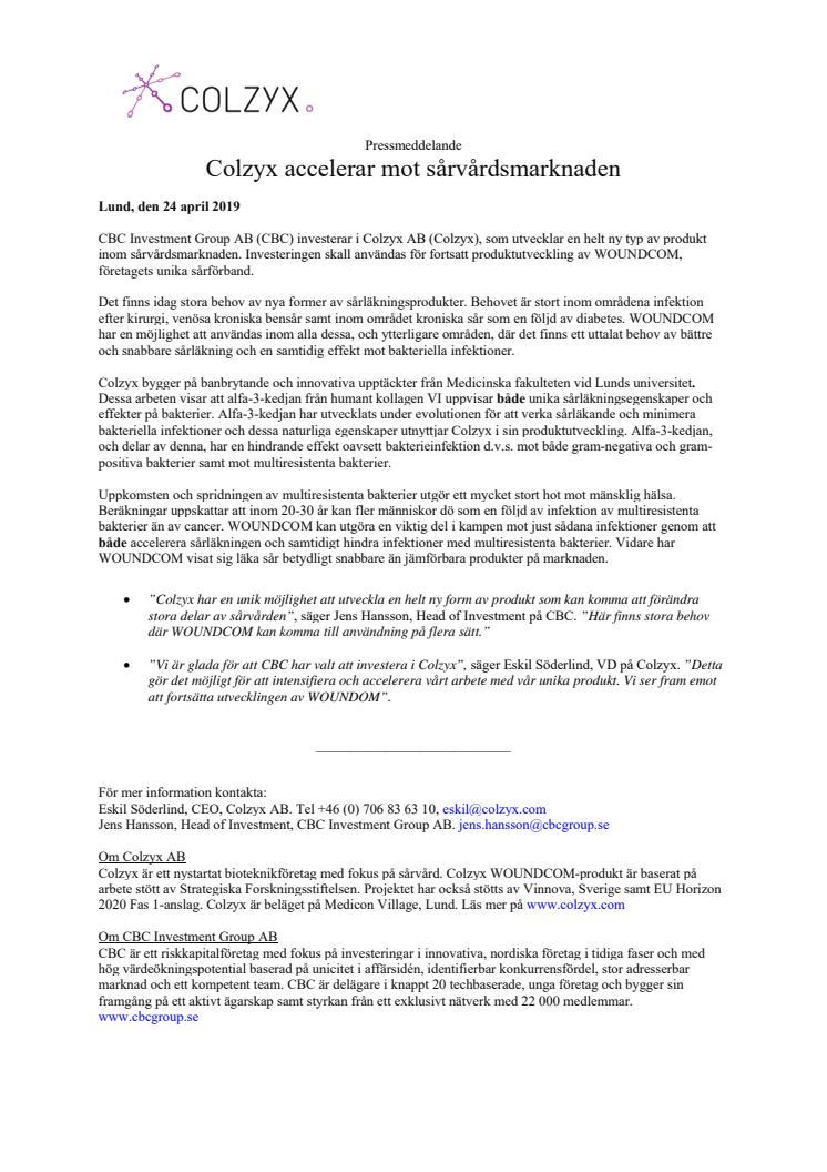 CBC Investment Group AB (CBC) investerar i Colzyx AB (Colzyx), som utvecklar en helt ny typ av