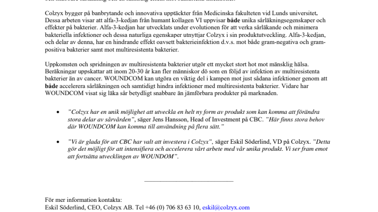CBC Investment Group AB (CBC) investerar i Colzyx AB (Colzyx), som utvecklar en helt ny typ av produkt inom sårvårdsmarknaden. Investeringen skall användas för fortsatt produktutveckling av WOUNDCOM, företagets unika sårförband.
