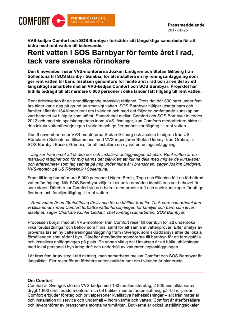 VVS-kedjan Comfort och SOS Barnbyar fortsätter sitt långsiktiga samarbete för att bidra med rent vatten till behövande.