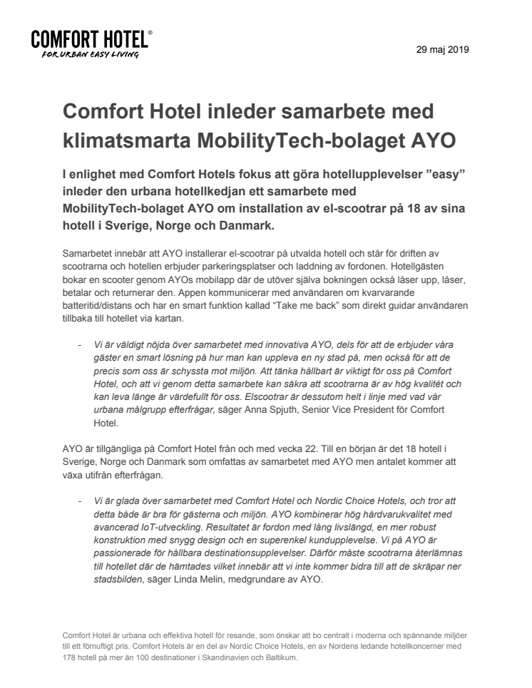 Comfort Hotel inleder samarbete med klimatsmarta MobilityTech-bolaget AYO