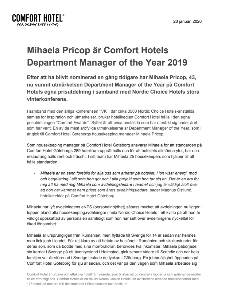 Mihaela Pricop är Comfort Hotels Department Manager of the Year 2019