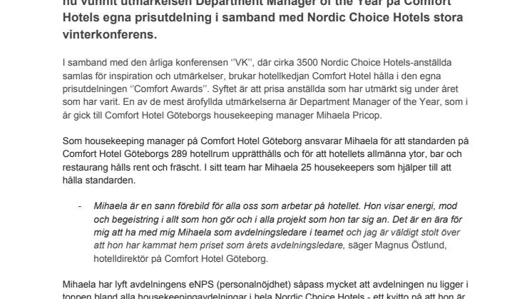 I samband med den årliga konferensen ‘’VK’’, där cirka 3500 Nordic Choice Hotels-anställda samlas för inspiration och utmärkelser, brukar hotellkedjan Comfort Hotel hålla i den egna prisutdelningen ‘’Comfort Awards’’. Syftet är att prisa anställda som har utmärkt sig under året som har varit. En av de mest ärofyllda utmärkelserna är Department Manager of the Year, som i år gick till Comfort Hotel Göteborgs housekeeping manager Mihaela Pricop.