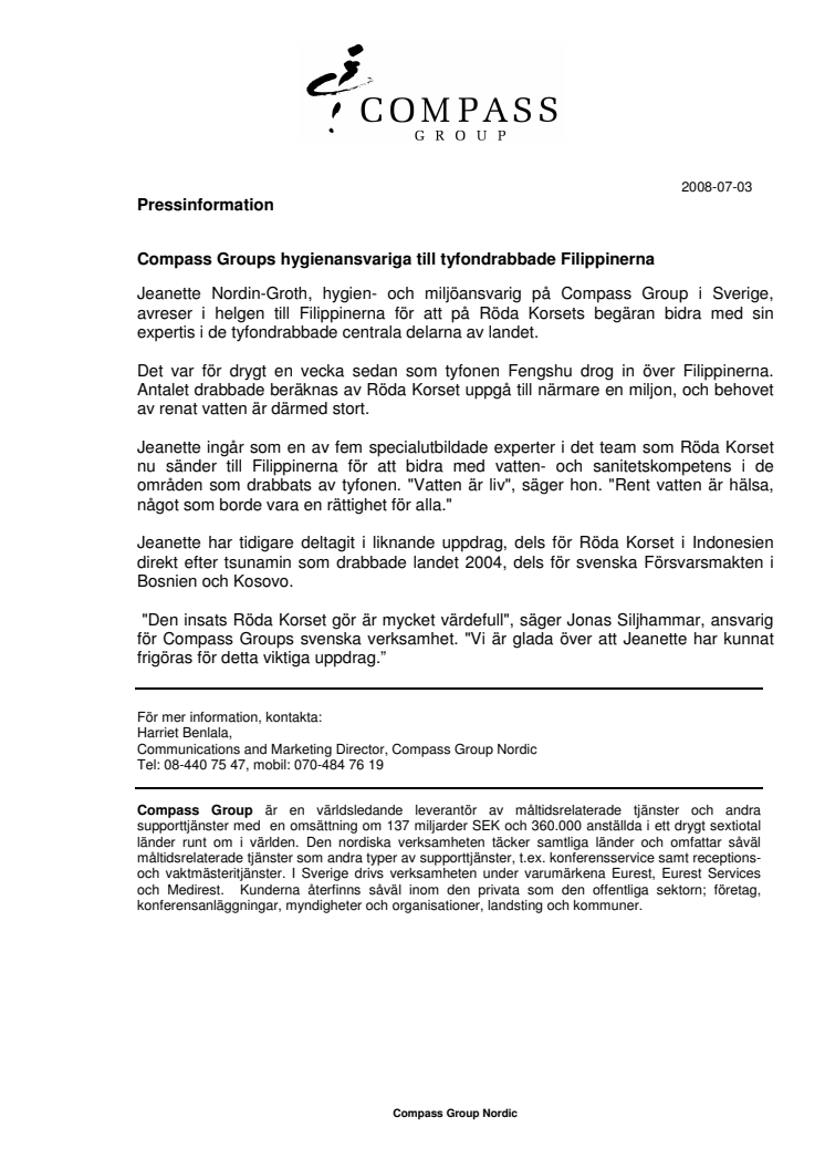 Compass Groups hygienansvariga till tyfondrabbade Filippinerna
